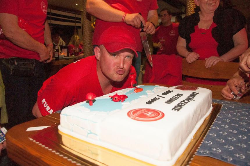 To jeszcze nie koniec. Kogut Sezonu wpadł na scenę ze specjalnym tortem i beczułką z czymś tajemniczym. Jedno i drugie, jak to u Kuraka, było niespodzianką. Ten, bez niespodzianek nie potrafi. Zawartością beczułki wznieśliśmy toast za zdrowie Wielkiego Nieobecnego, który w trakcie ostatniej wędrówki na Babią Górę chciał się od nas na zawsze uwolnić. Na szczęście nie pozwoliliśmy mu na to. Zdrowie Leszku!