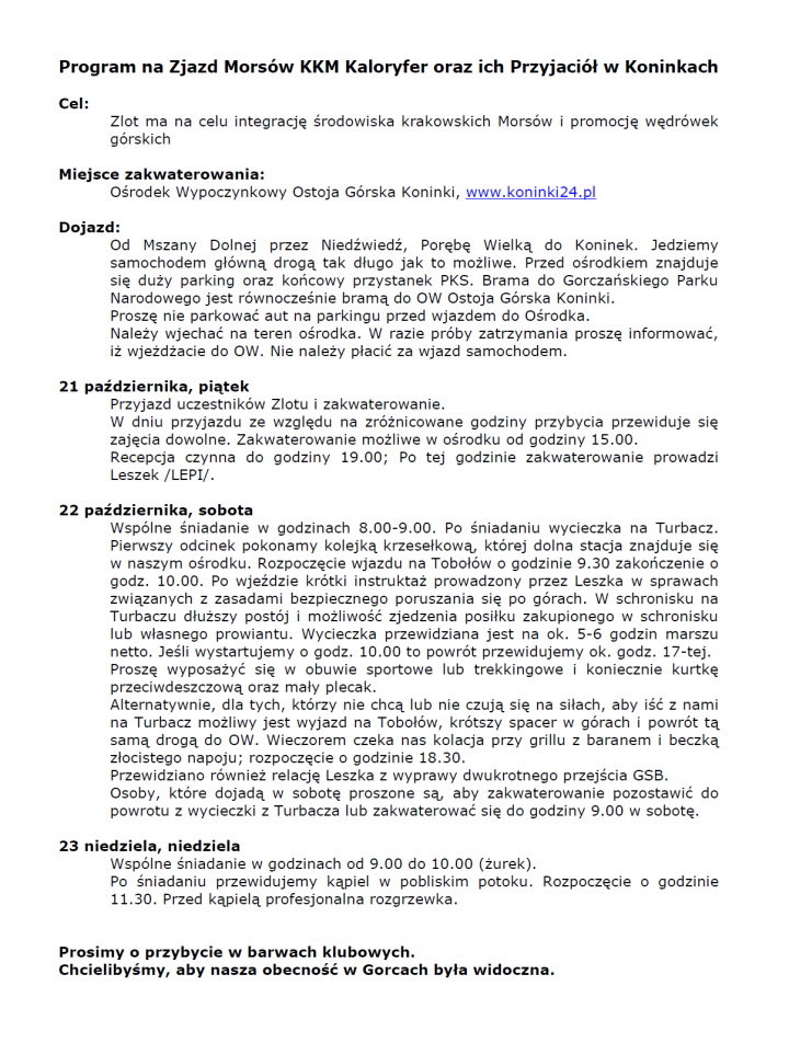 Jak pewnie wiecie w najbliższy weekend tj. 21-23 października w Koninkach pod Turbaczem odbędzie sie Zlot Morsów KKM Kaloryfer.